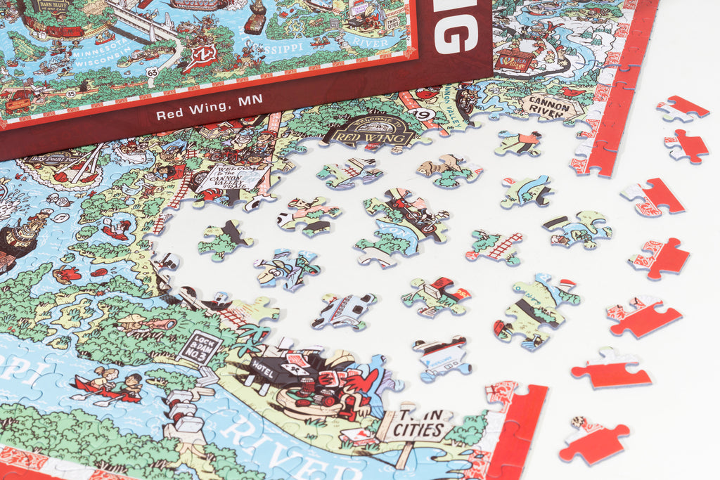 Artist Kevin Cannon (pictured here with Finnigan), inspired by childhood trips to Red Wing, now enjoys climbing Barn Bluff and strolling the historic streets of Red Wing with his family. Cannon has been the commemorative artist for the Minnesota State Fair and the Saint Paul Winter Carnival. He is thrilled to bring his vibrant style to this cartoon map. Like Red Wing, the puzzle is rich with discoveries, promising endless fun around every corner!