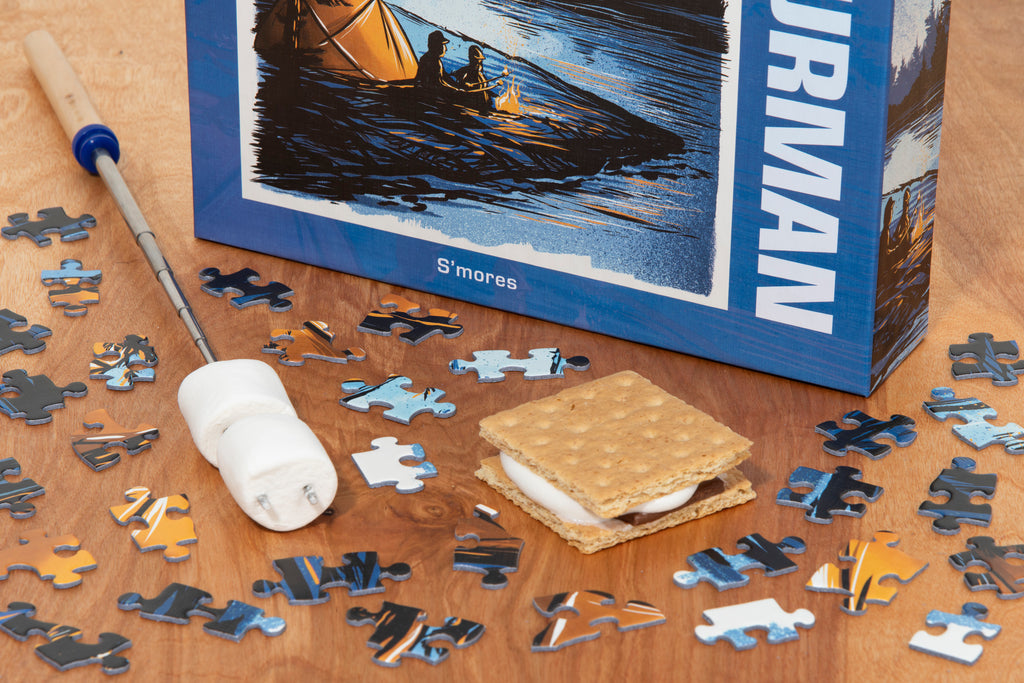 Adam Turman, a Twin Cities-based artist, illustrator, and muralist, is well known for his vibrant, eye-catching imagery.  S'mores captures a favorite camping tradition of roasting marshmallows by the campfire.  This puzzle ignites outdoor adventure, inviting you back fro 'some more' fun with each piece you connect.