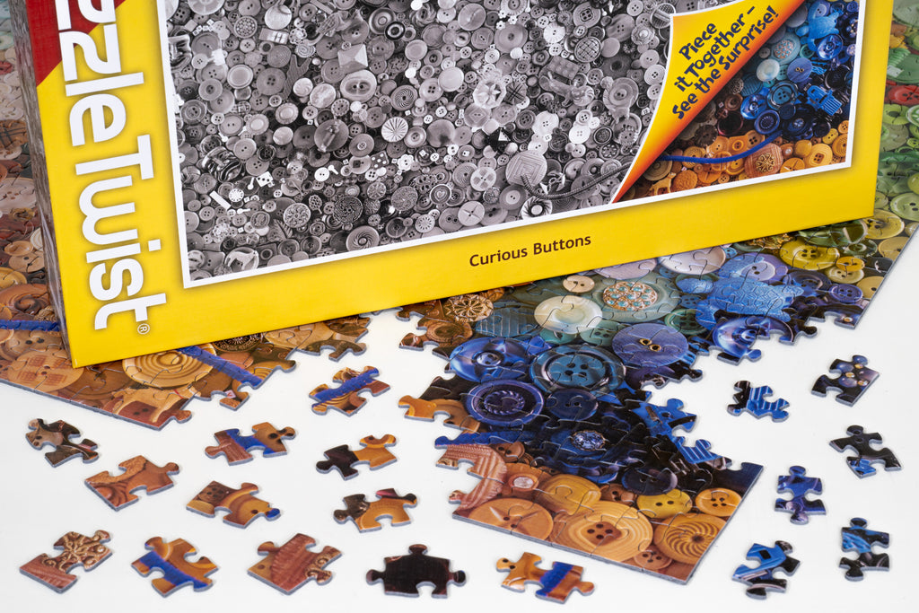 Don’t be fooled by the black and white—this puzzle hides a colorful surprise! As the color of each button clicks into place, a secret image begins to emerge. Brought to life by artist Steve Barry, a longtime creative force behind PuzzleTwist, this clever design offers plenty of fun as the twist unfolds piece by piece.