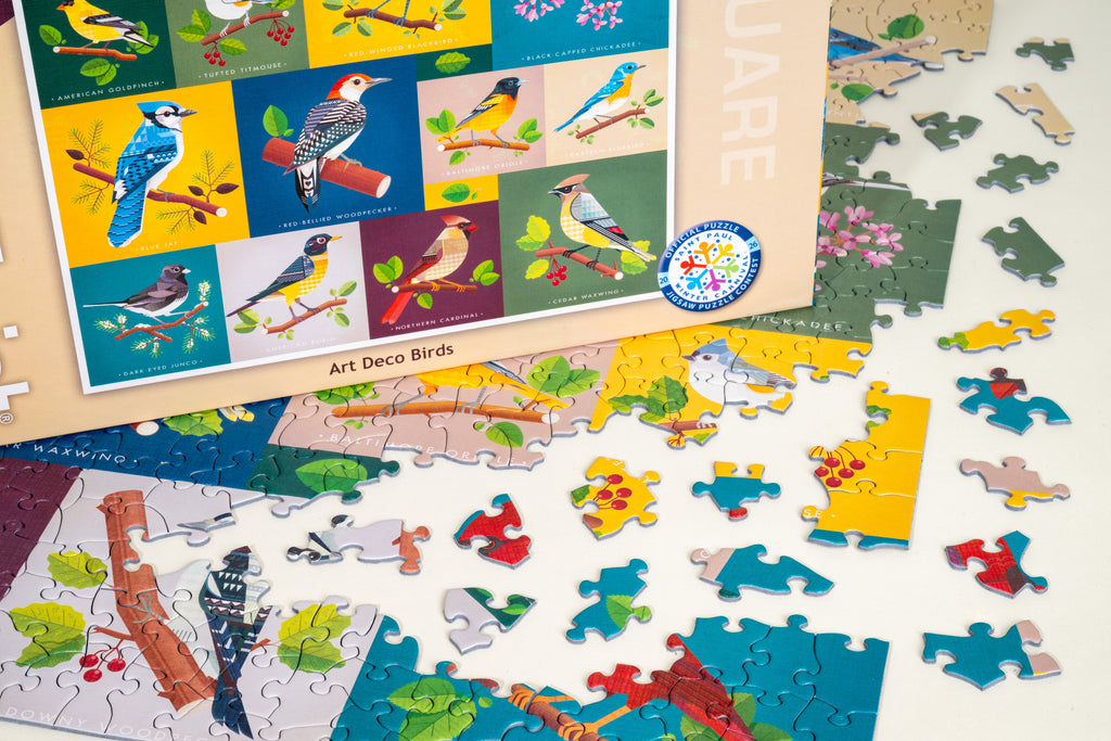 Illustrator Tim Chapman, an Australian artist now rooted in Minnesota, brings his bold colors and graceful geometry to Art Deco Birds. His love of nature and storytelling shines through a timeless design featuring sixteen beloved songbirds—some perched in unexpected places—sure to delight birders and puzzlers alike.